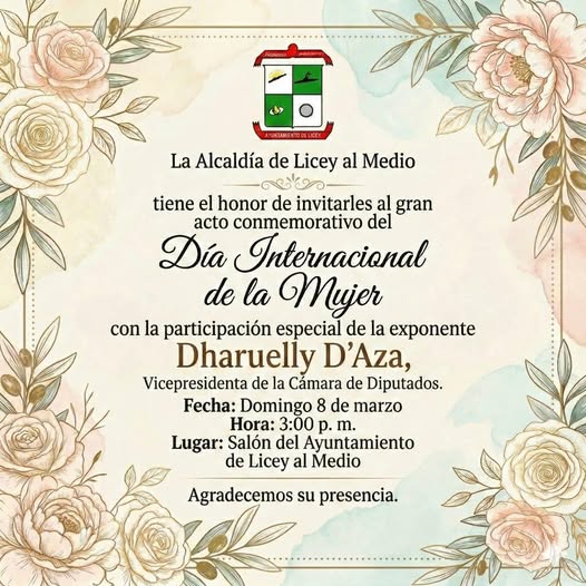 La Alcaldía de Licey al Medio tiene el honor de invitarles al gran acto conmemorativo del Día Internacional de la Mujer, con la participación especial de la exponente Dharuelly D’Aza, Vicepresidenta de la Cámara de Diputados.