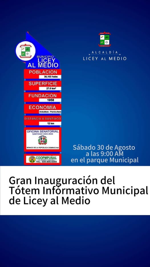 Este sábado 30 de agosto, a las 9:00 a.m., estaremos junto a la comunidad en la inauguración del Tótem Informativo de Licey al Medio, frente al ayuntamiento.