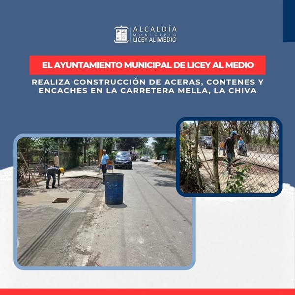El Ayuntamiento Municipal de Licey al Medio continúa trabajando por el desarrollo de nuestro municipio con la construcción de aceras, contenes y encaches en la Carretera Mella, Licey Abajo (La Chiva), específicamente en el tramo Cruz de Isalguez – Los Cercadillos.