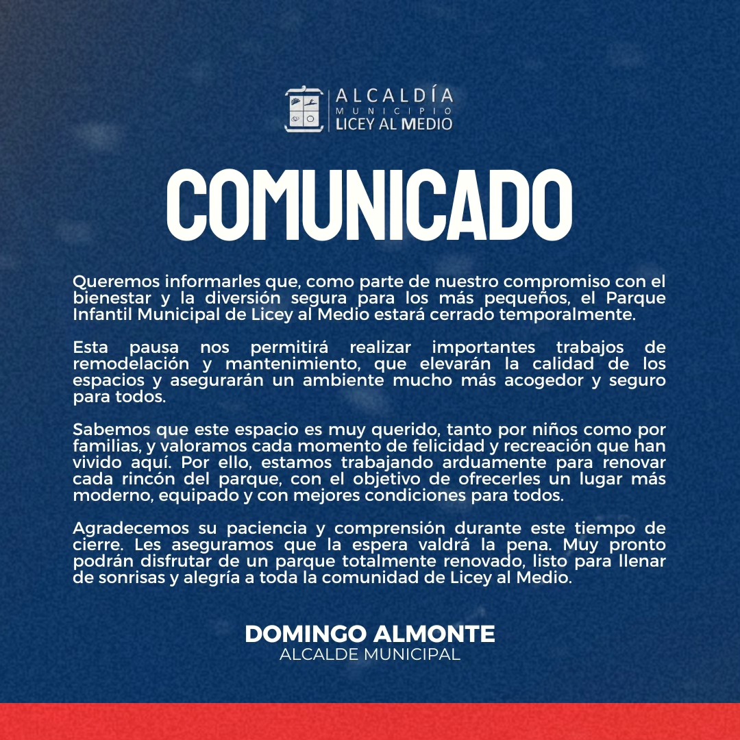 Mensaje del Alcalde, Domingo Almonte sobre el cierre temporal del Parque Infantil Municipal.
