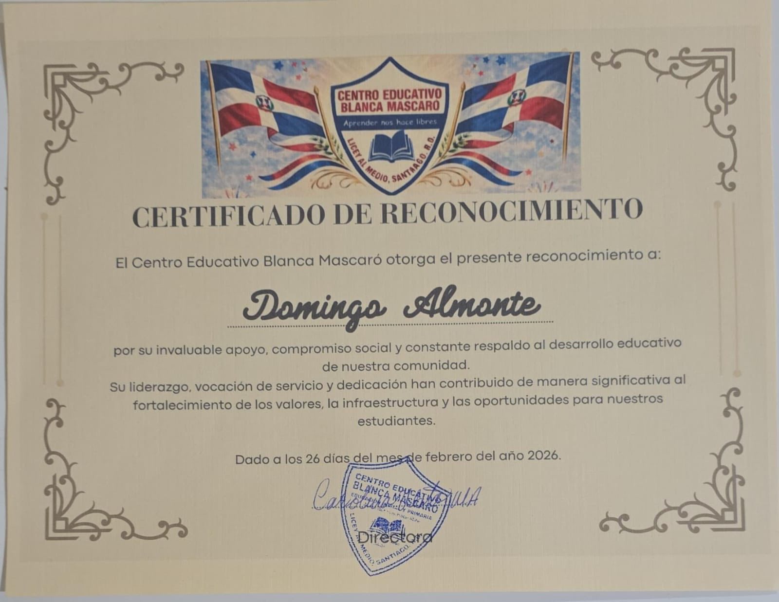 Felicitaciones a nuestro alcalde Domingo Almonte, quien recibió un merecido reconocimiento por parte de la Escuela Blanca Mascaró por su destacada labor social y solidaria con el municipio.